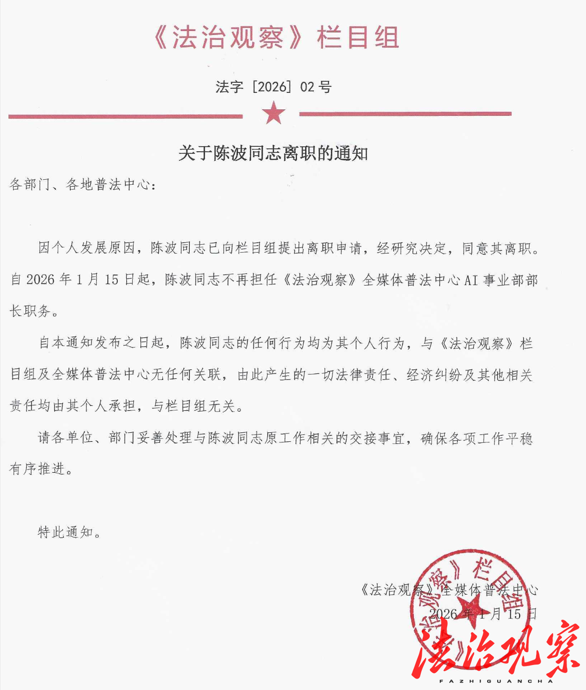 关于《法治观察》陈波同志离职通知