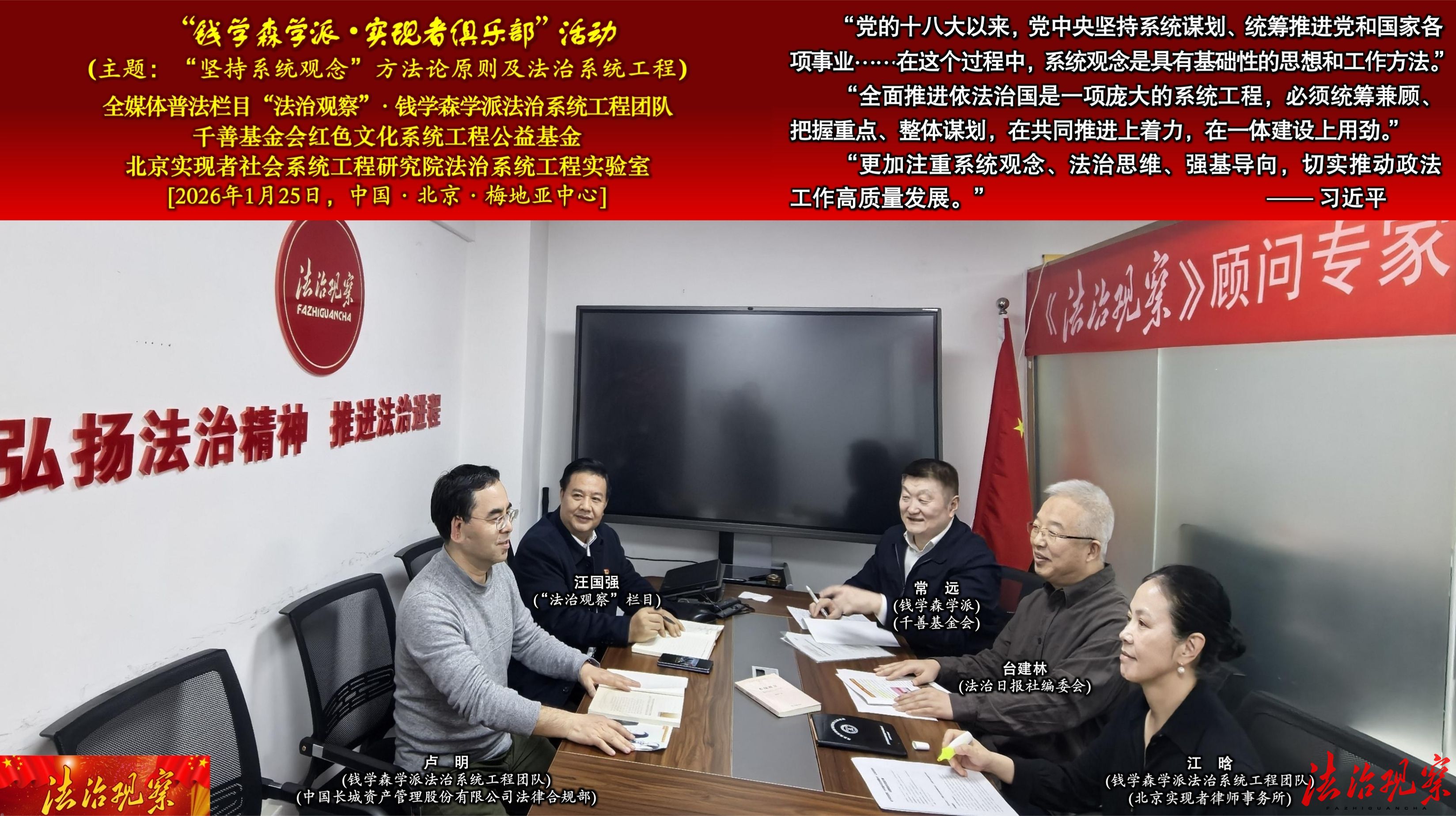 (法治观察网讯)2026年1月25日,全国首家全媒体普法栏目“法治观察”与千善基金会红色文化系统工程公益基金、千善基金会特别公益工程“(钱学森学派)实现者俱乐部”、钱学森学派法治系统工程团队、北京实现者社会系统工程院法治系统工程实验室,在北京梅地亚中心联合举办以“‘坚持系统观念’方法论原则及法治系统工程”为主题的“(钱学森学派)实现者俱乐部”公益活动。