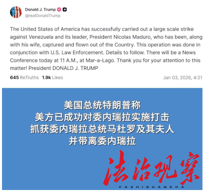新华社快讯:美国总统特朗普称,美方已成功对委内瑞拉实施打击,抓获委内瑞拉总统马杜罗及其夫人,并带离委内瑞拉。